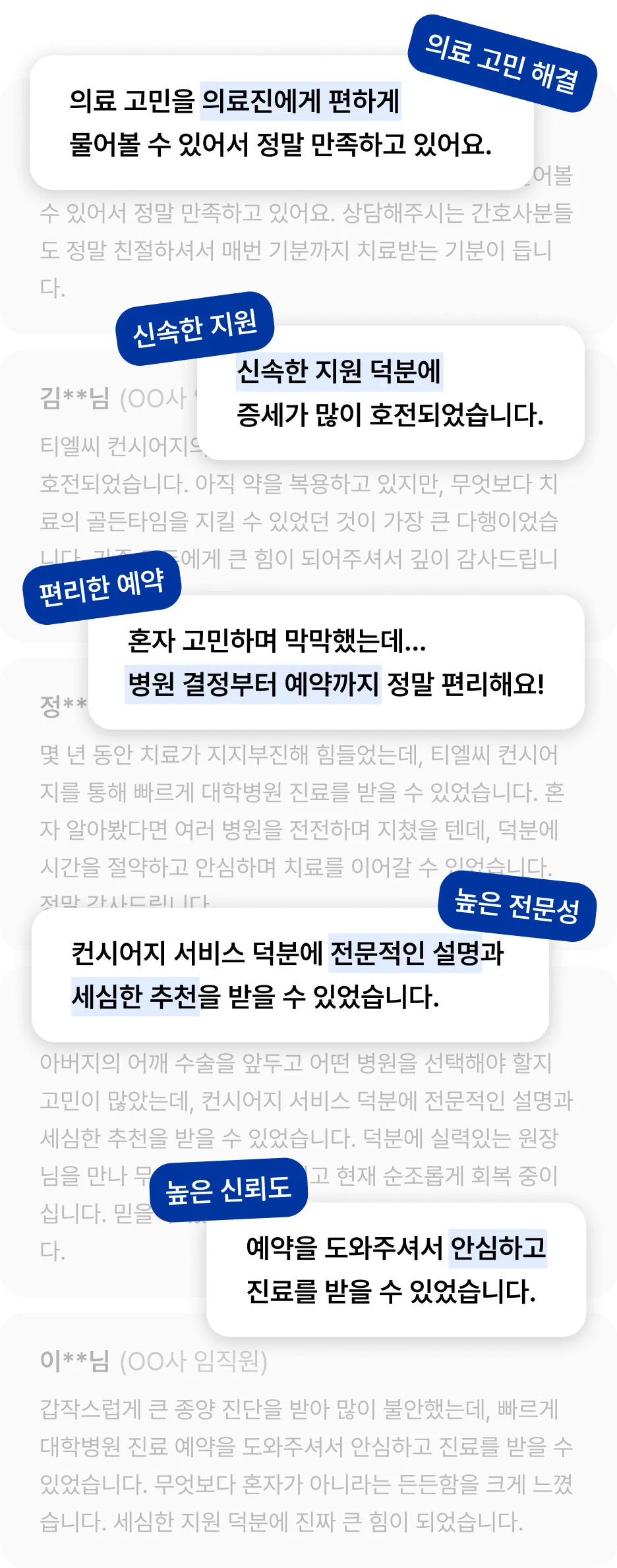 TLC 의료진은 임직원 및 가족분들의 의료적 고민을 신속하게 해결해드리며, 의료 서비스의 모든 과정을 든든하게 지원해드립니다.